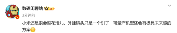 【CNMO科技消息】3月6日,“数码闲聊站”爆料称:“小米还是很会整花活儿,外挂镜头只是一个引子,可量产机型还会有极具未来感的方案。”