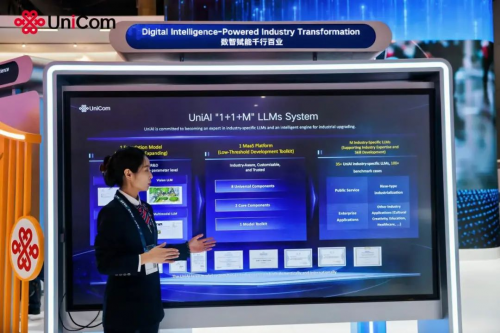 在AI能力与应用展区,联通元景“1+1+M”大模型与可信数据资源空间“C”位亮相,以数智融合为核心,为千行百业提供“数据+模型”双底座支撑。该体系源于中国联通科技创新、成果转化形成的数智系列产品,包括1套基础大模型+1个大模型平台+M个行业大模型应用及一体化可信数据服务平台,拥有模型库、数智工具箱、原生应用商店等板块,为民生、医疗、教育、文博文创等多个领域提供强大的智能服务。