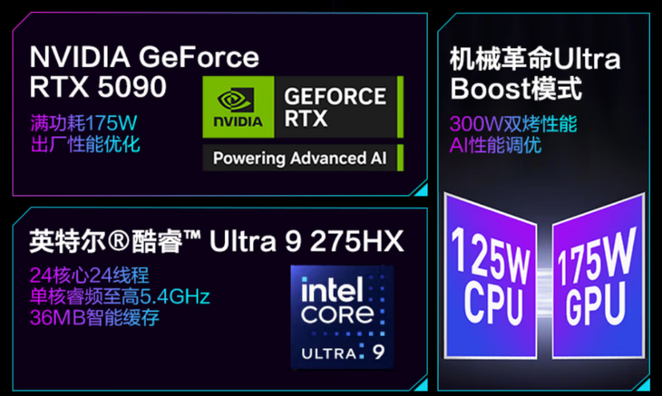 从芯片层面,机械革命耀世16 Ultra带来了行业顶级的表现,在此基础上,机械革命耀世16 Ultra还带来了Ultra Boost模式和AI智能性能调优,从而更好的发挥出旗舰硬件的全部性能,机械革命耀世16 Ultra至高可以实现300W的双烤表现,其中处理器可以达到125W,GPU可以达到175W,实现持续的满功耗输出,达到行业领先的性能表现。