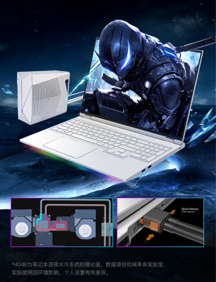 值得一提的是,机械革命耀世16 Ultra还提供了水冷接口,支持水冷散热,在水冷散热的加持下,满载情况下也只有40dB,带来更安静的使用体验。