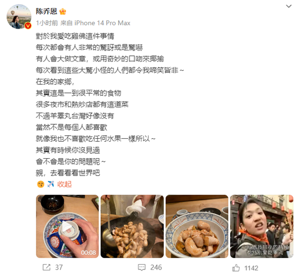 3月6日消息,明星陈乔恩今日发布微博回应了自己爱吃鸡佛一事,其表示: