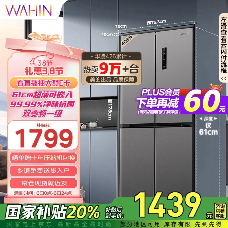 华凌406升冰箱京东优惠,低至1375元