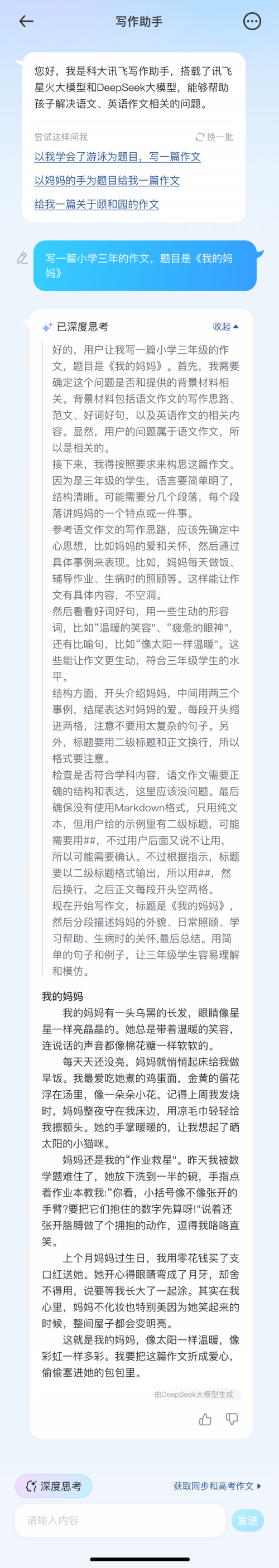 在作文辅导方面,家长端预先设置了高频写作主题的要求,家长无需冗长的文字输入,AI就能通过深度思考生成清晰的写作思路和高质量范文,且其思考过程全程可视化,家长可依据思路轻松辅导孩子,让作文辅导不再是"玄学"。而且,所有的范文及AI思考过程仅在手机端呈现,为家长辅导提供参考,有效避免对孩子自主思考的干扰。