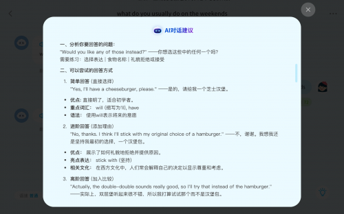 当孩子不知道该怎么表达时,AI为孩子准备了简单、进阶和高阶三种不同层次的回答参考,从“今天天气真好”到“全球气候变暖辩论”,满足不同水平孩子的学习需求。当然,AI并非简单灌输答案,而是会为孩子深入分析不同回答方式的亮点、运用到的重点词汇语法等,提示常见错误表达,让每一次对话都收获满满。