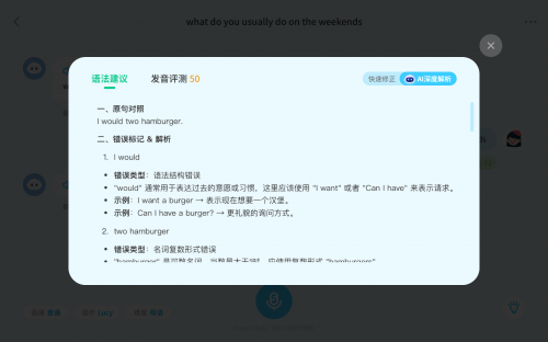 孩子每回答一句,AI都会及时判断是否有语法、词汇用法与中式表达错误,并进行细致润色,同时清晰讲解润色的依据,传授孩子 “表达策略”,如优雅转换话题、用连接词提升逻辑性等,让孩子的表达更准确、更自然、更地道。