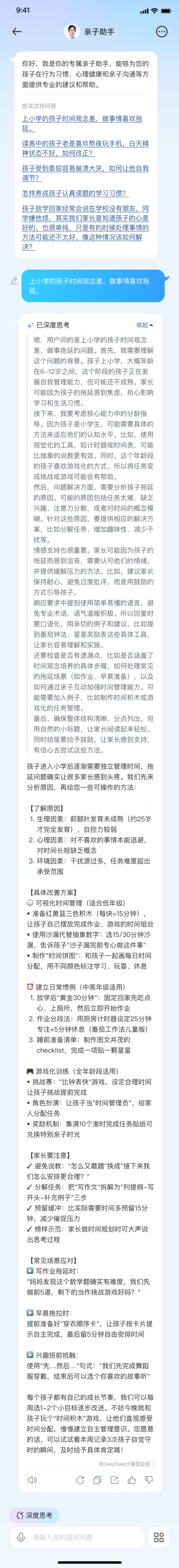 科大讯飞AI学习机不仅是孩子学习的得力助手,更前瞻性地关注到家长在教育过程中的全方位需求,“讯飞星火+DeepSeek”双引擎为家长提供了更专业、更全面的教育支持,成为家长教育孩子的强大智囊团。无论是亲子沟通难题,还是学习辅导困惑,AI都能通过深度思考分析,精准洞察孩子各种行为背后的深层原因,以高情商的方式给出实用的亲子沟通建议,定制专属教育方案,省时又省心。
