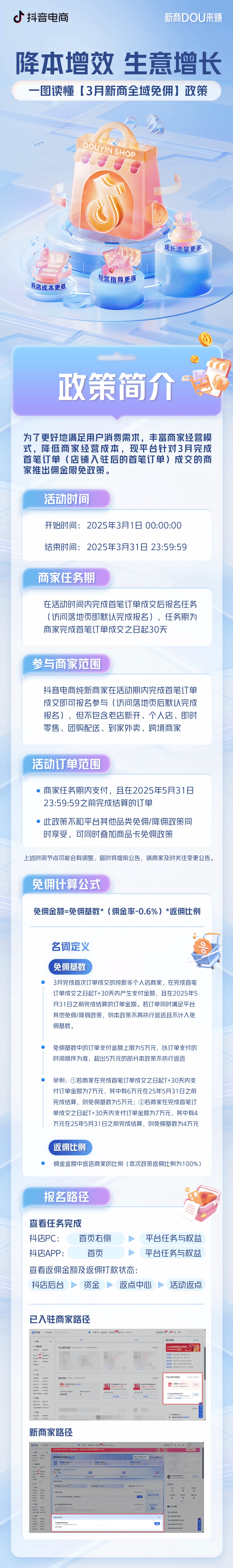抖音电商免佣政策重磅加码,3月面向新商开启全域免佣!3月1日-3月31日期间,完成首笔订单成交的商家,可享受全域佣金最高100%减免,还能叠加享受商品卡免佣政策。