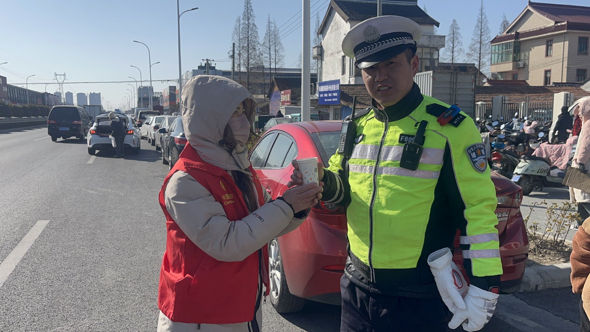 南通移动海门分公司在招聘会现场设置“移动服务展台”,志愿者耐心细致地为求职者解疑答惑。由于人才招聘市场在户外,天气寒冷,工作人员热情地为务工人员、执勤交警及网格员送上姜茶和暖宝宝,“今天我一早就出来执勤了,在招聘会门口指挥车辆冻的脸都麻了,感谢移动志愿者的热茶,喝了姜茶,身上暖了,心里更暖!”执勤交警捧着拿到的姜茶开心地说道。