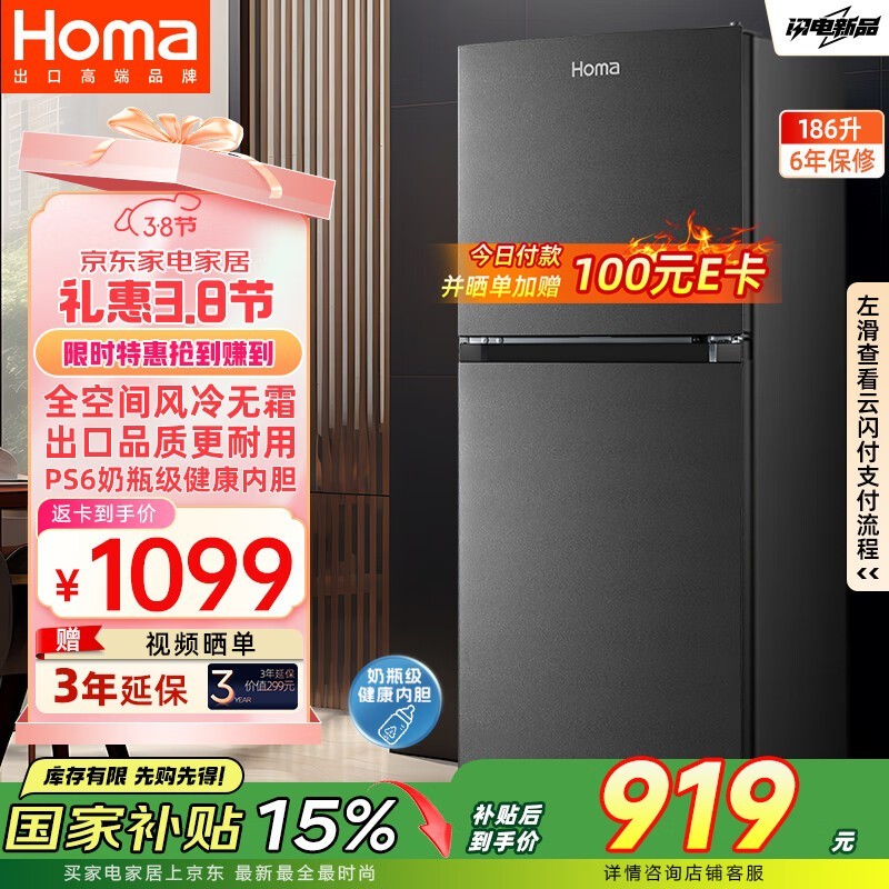 奥马BCD - 186WH冰箱促销,到手价889元