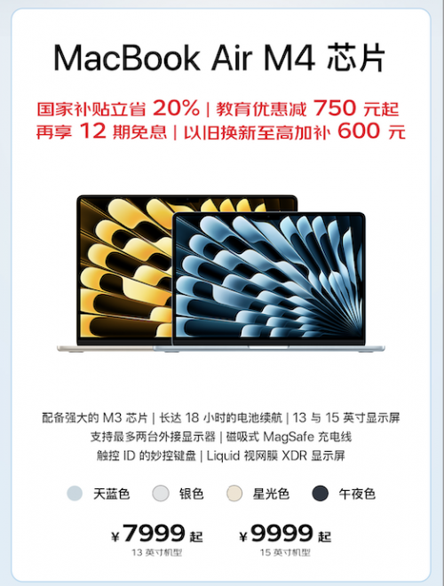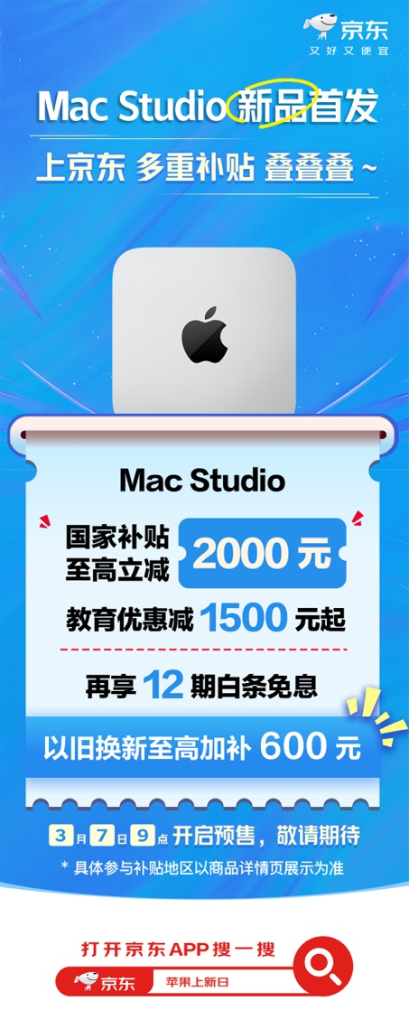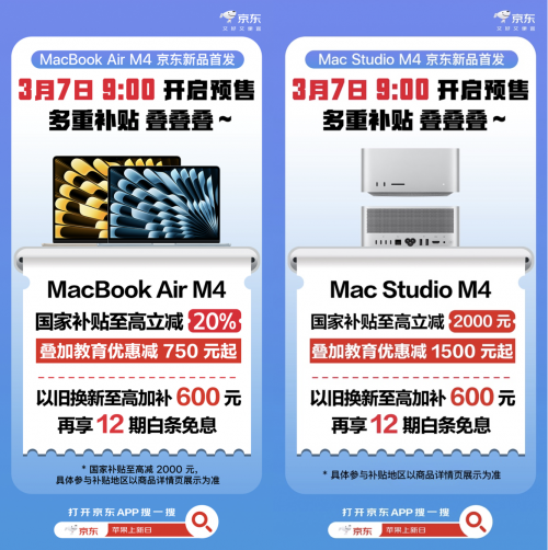3月5日晚10点,Apple发布搭载M4芯片的全新MacBook Air,以及搭载M4 Max和全新M3 Ultra芯片的新款Mac Studio,售价7999元起,3月7日早9点开始预购,3月12日正式发售。目前,京东已开启预约,消费者在京东购买Mac新品可享国家补贴至高省2000元、以旧换新加补600元、再享12期免息,还可叠加教育优惠。其中MacBook Air M4叠加学生教育优惠减750元起,新款Mac Studio叠加学生教育优惠减1500元起。买Mac新品上京东,多重补贴叠加更省钱,只需打开京东搜索“苹果上新日”即可直达。
