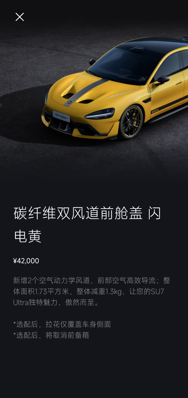 小米汽车App显示,碳纤维双风道前舱盖选装价格为4.2万元,新增2个空气动力学风道,前部空气高效导流,整体面积1.73平方米,整体减重1.3kg。
