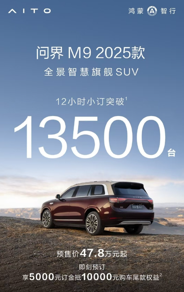 问界M8 12小时小订突破2.8万台 新M9也突破1.35万台