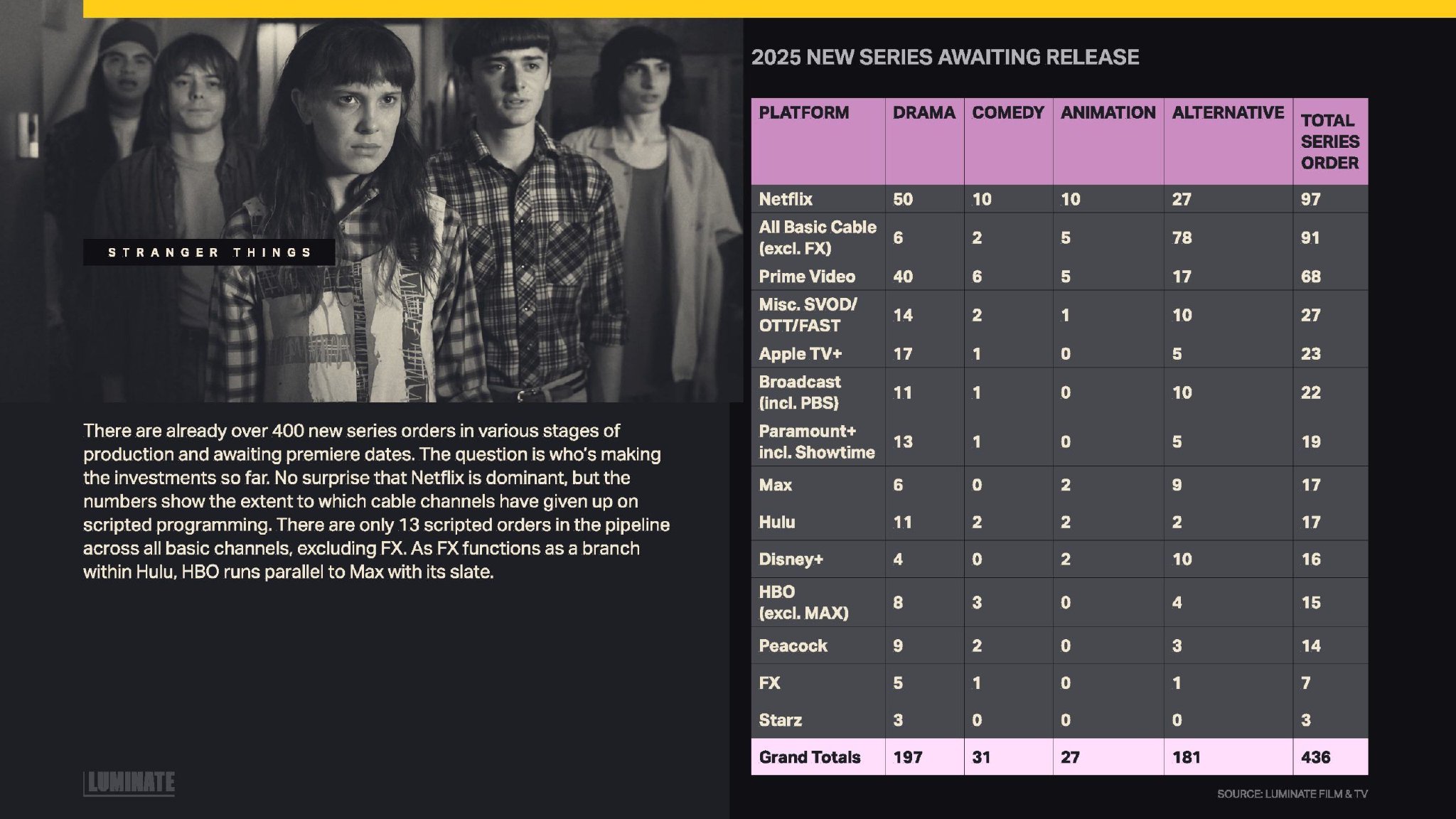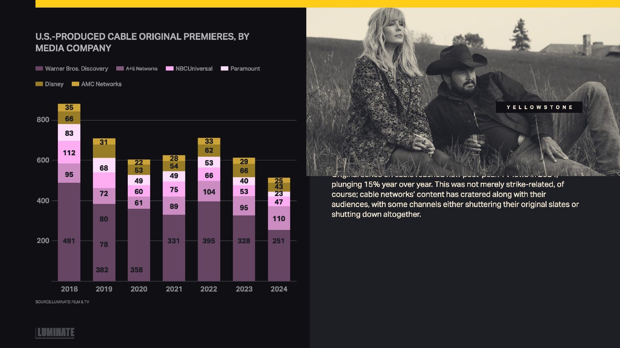 2024年,有线电视的原创剧集达到了后高峰时期的新低,同比下降了15%。这当然不仅仅是罢工的影响;有线电视网络的内容随着观众的减少而大幅下滑,一些频道要么停止了原创节目制作,要么完全关闭。
