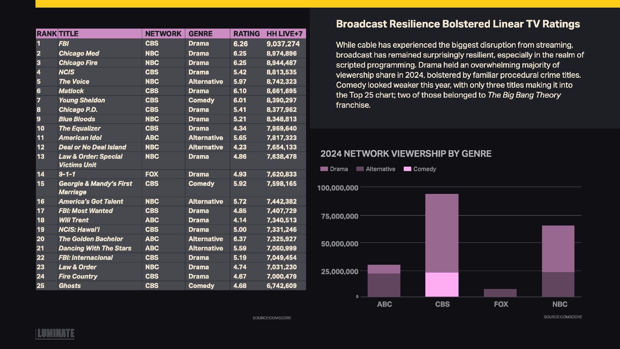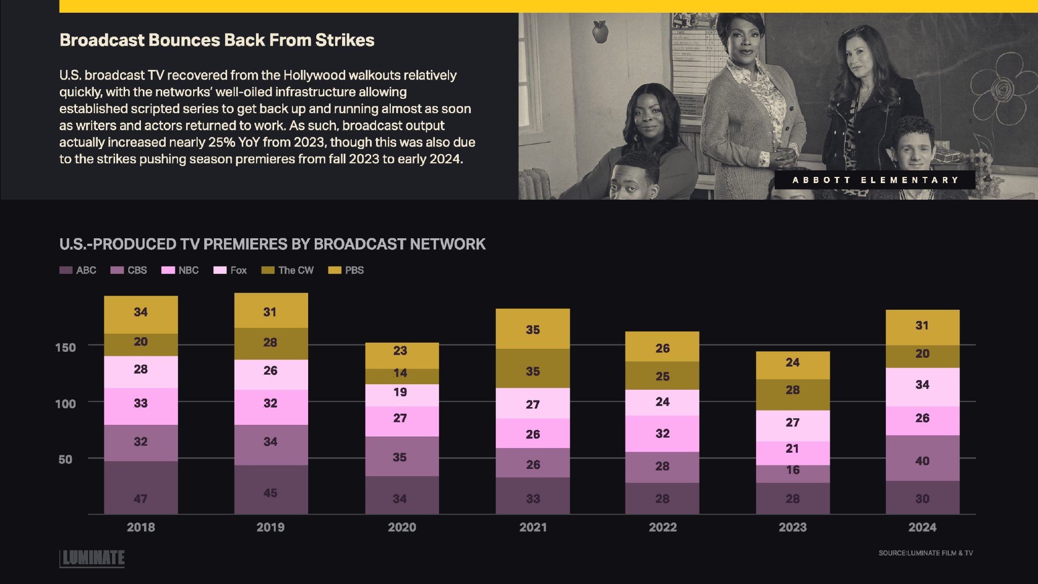 美国广播电视从好莱坞罢工中相对迅速地恢复过来,各电视台的高效基础设施使得已建立的有剧本剧集几乎在编剧和演员复工后立即恢复运行。因此,广播电视的产量实际上较2023年同比增长了近25%,尽管这也是由于罢工将2023年秋季的首播推迟到了2024年初。