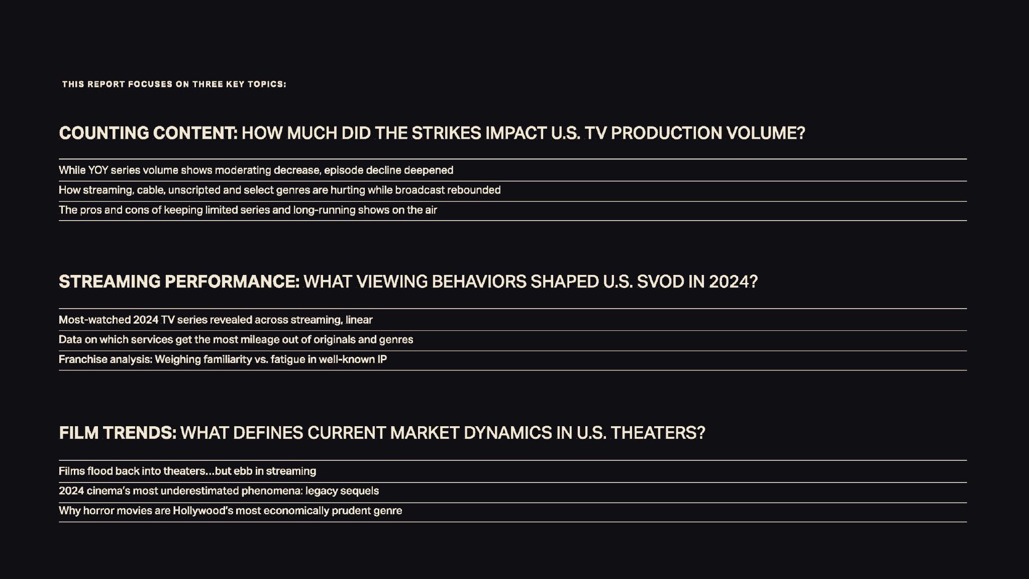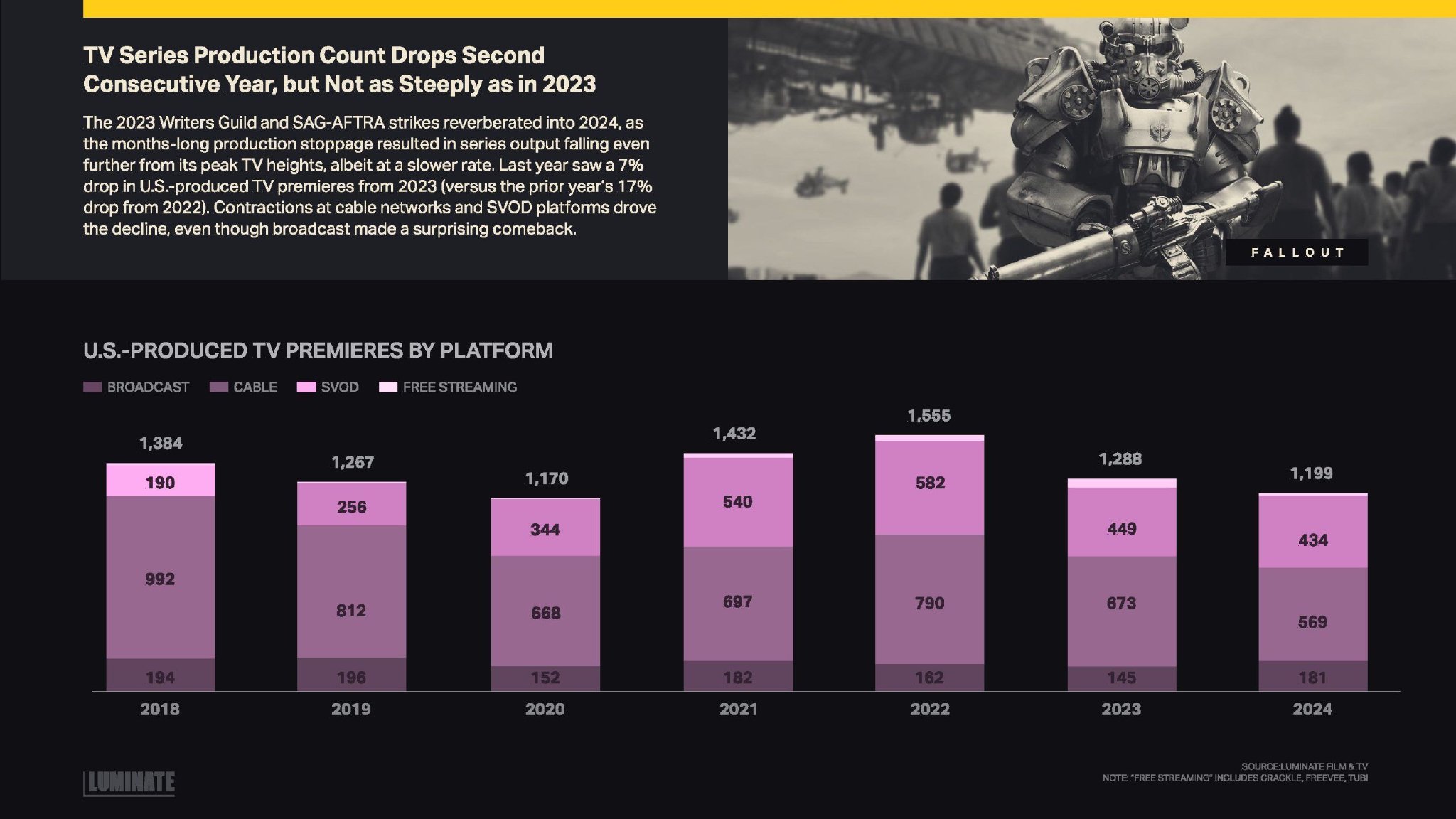 2023年编剧工会和SAG-AFTRA罢工的影响延续到了2024年,长达数月的制作停工导致电视剧产量进一步从高峰下降,尽管下降速度有所放缓。去年,美国制作的电视剧首播量较2023年下降了7%(而2023年较2022年下降了17%)。传统电视网络和SVOD平台的收缩推动了这一下降,尽管广播电视出人意料地有所回升。