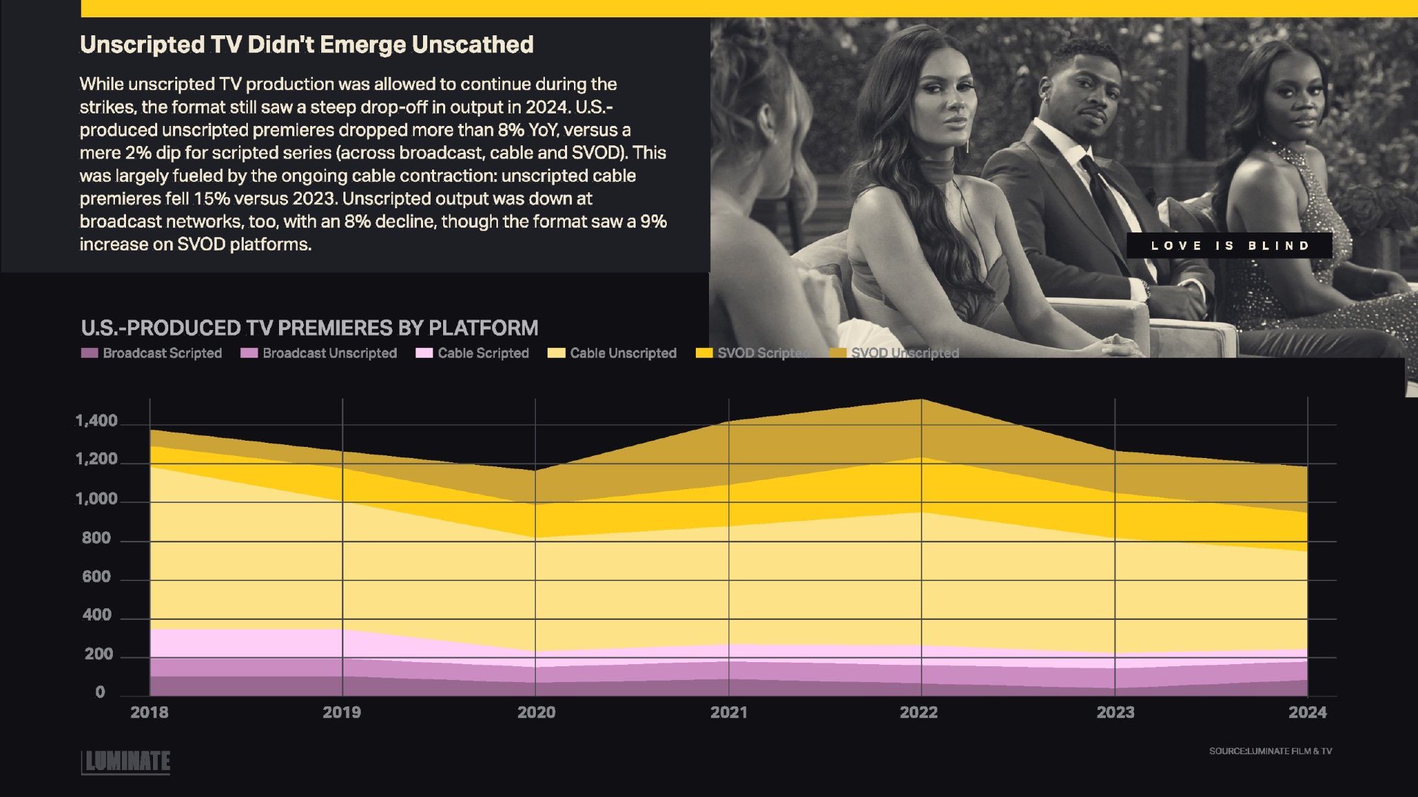 尽管在罢工期间无剧本电视节目的制作得以继续,但2024年该类型的产量仍大幅下降。美国制作的无剧本节目首播量同比下降超过8%,而有剧本剧集(包括广播、传统电视和SVOD平台)仅下降了2%。这一下降主要受到有线电视持续收缩的影响:无剧本传统电视节目首播量较2023年下降了15%。广播网络的无剧本节目产量也有所下降,降幅为8%,尽管该类型在SVOD平台上增长了9%。