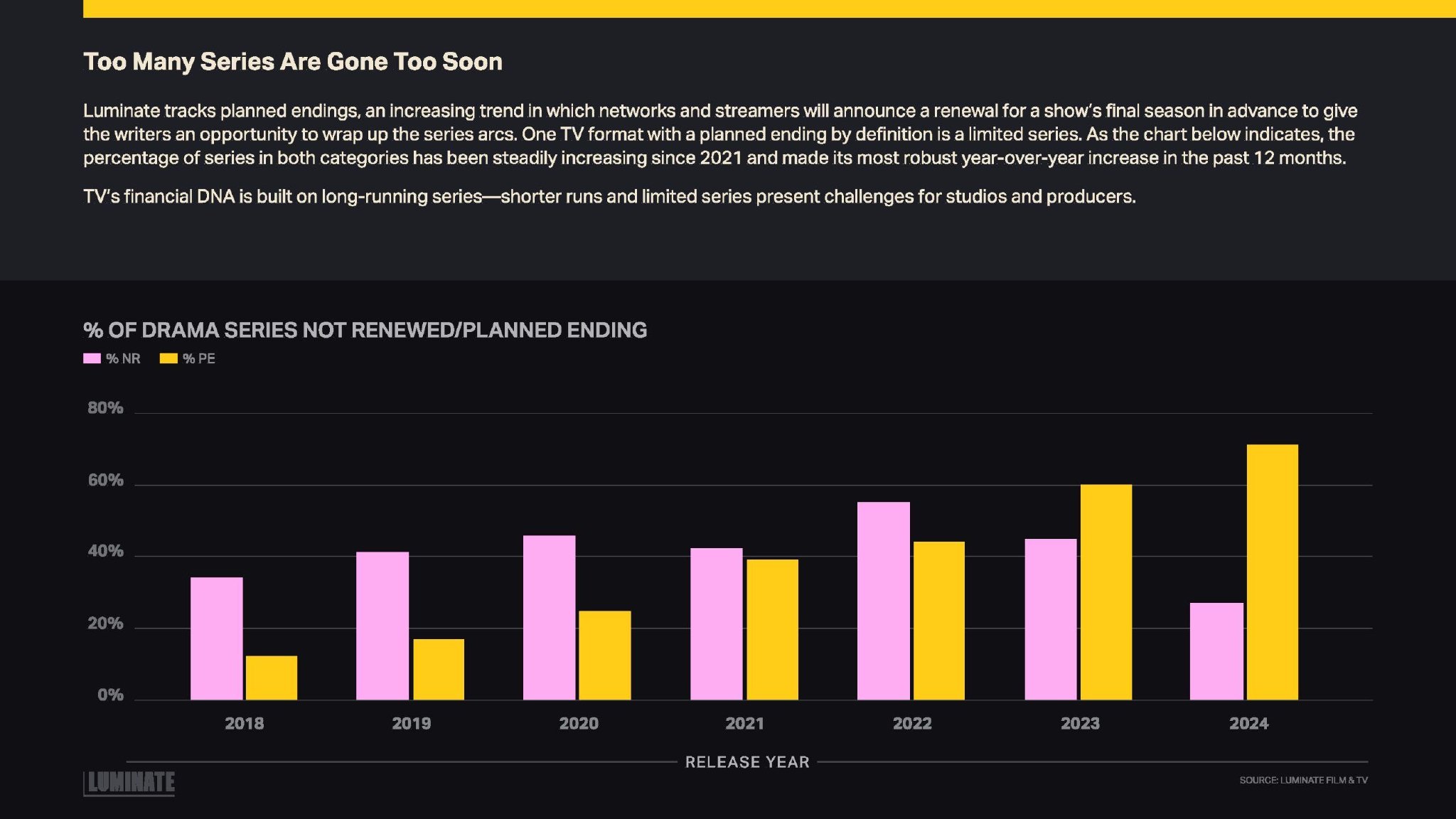 Luminate追踪了计划性结局,这一趋势日益增长,即网络和流媒体平台会提前宣布续订剧集的最终季,以便编剧有机会完成剧集的故事线。从定义上讲,计划性结局的一种电视形式是限定剧集。