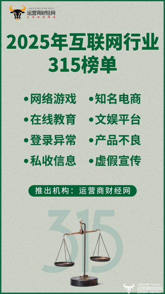 据了解,运营商财经网315质量榜已连续推出多年,在行业内形成了显著的影响力。而此次推出的互联网行业315质量榜单,依旧涵盖多个细分领域,包含网络游戏、知名电商、在线教育、文娱平台、医疗健康服务平台等,内容涉及生产、销售不合格产品,违规收集个人信息,服务器登录异常,虚假宣传……