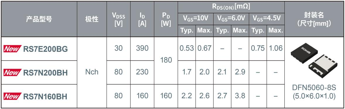 新产品共3款机型,包括非常适用于企业级高性能服务器12V系统电源的AC-DC转换电路二次侧和热插拔控制器(HSC)*4电路的“RS7E200BG”(30V),以及非常适用于AI服务器48V系统电源的AC-DC转换电路二次侧的“RS7N200BH(80V)”和“RS7N160BH(80V)”。
