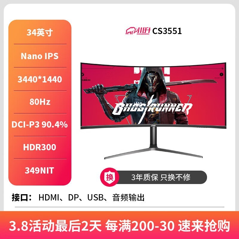 川升CS3551 34寸4K曲面屏京东价908元