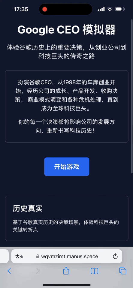 用了差不多一个小时,Manus把谷歌CEO模拟器的网页游戏开发好了,完成度很高,点击开始游戏,还会让你自选难度,接着就会面对谷歌发展史上的每一次转变节点,你的选择会决定公司资源的变化,并影响最终的游戏结局。