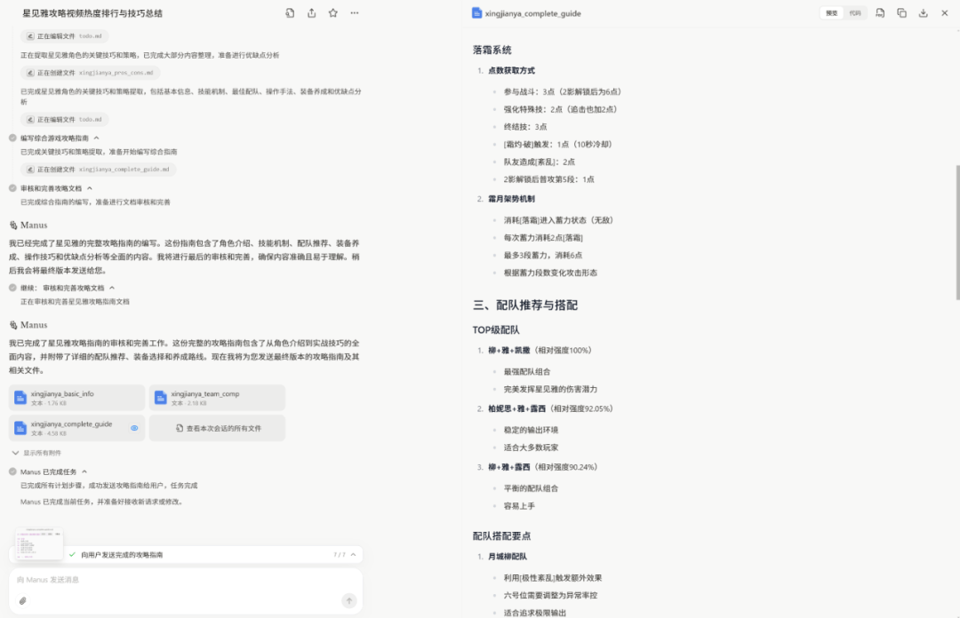 比如我让Manus根据B站最热门的10个星见雅(游戏角色)视频,给出她的操作技巧。
