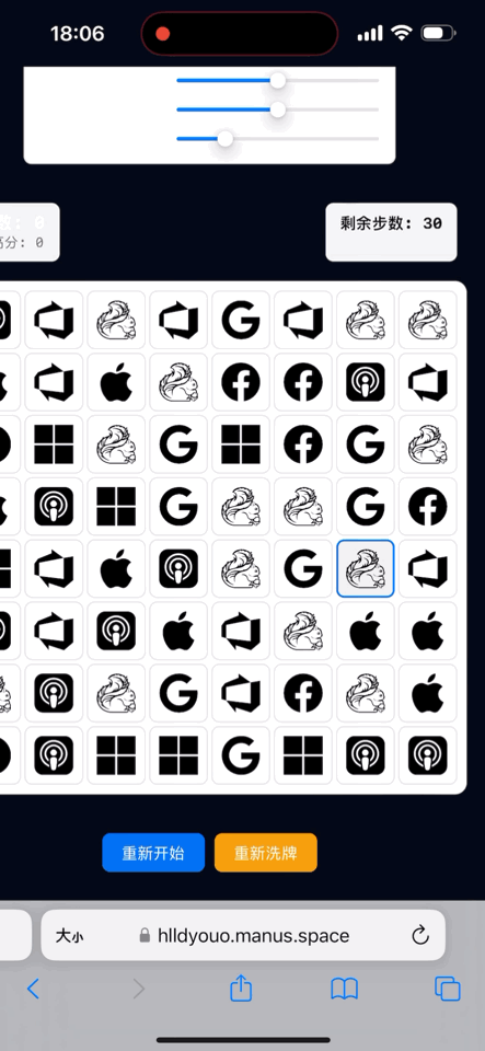 本着尽可能让AI Agent独立完成工作的原则,我没有这么做,而是稍微改了一下需求,让Manus改用科技公司的logo来做游戏图标,因为开放版权的SVG素材全网都是,所以这下Manus跑起来就没什么问题了,很快就做完了一个带积分的消消乐游戏,玩起来也算顺畅。