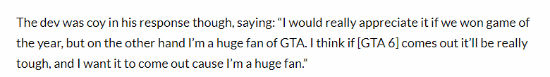 “我当然希望能再赢一次年度游戏,但另一方面,我也是GTA的超级粉丝。如果《GTA6》真的在2025年发布,那肯定是一个难以超越的对手。”