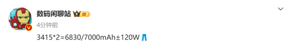 【CNMO科技消息】3月7日,数码闲聊站爆料称,iQOO一款定位中端的新机将采用双电芯设计,每块电芯的容量为3415mAh,综合额定容量为6830mAh,典型容量为7000mAh,同时支持120W的有线快速充电。