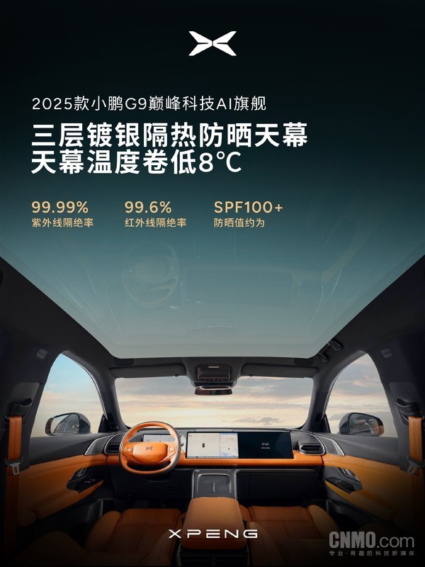 具体来看,2025款小鹏G9升级MicroFiber超纤绒顶棚,整车软质包覆率达到95%;前后排座椅均支持通风/加热/十点按摩,加入行业首创的指压设计,按摩力度据称是行业最大;Nappa真皮座椅采用12层舒适结构,兼具包裹性和支撑性的人体工学座椅;此外,新车还升级了三层镀银隔热防晒天幕,天幕温度卷低8°℃,紫外线隔绝率达99.99%,红外线隔绝率达99.6%,防晒值约为SPF100+,这对于女性用户来说有着不错的吸引力。