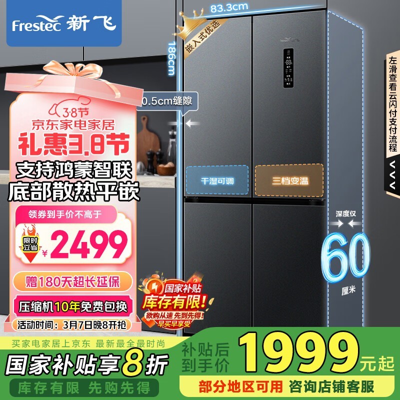 新飞445L零嵌十字门冰箱 京东活动价2679元