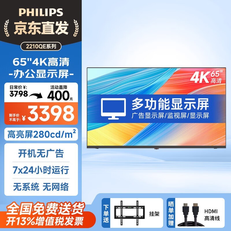 飞利浦65BDL2210QE:4K高清无干扰商务显示器,280cd/㎡亮度,3398元京东直发