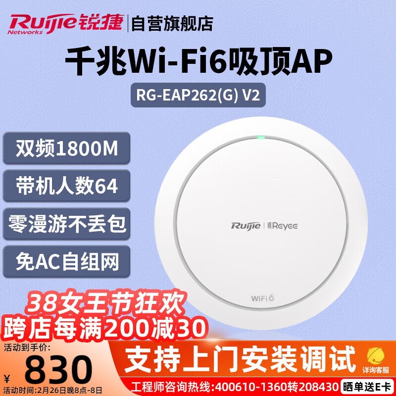 锐捷RG-EAP262(G)V2:双频1800M吸顶AP,商业级WiFi6路由器,无缝覆盖与企业级安全的性价比之选