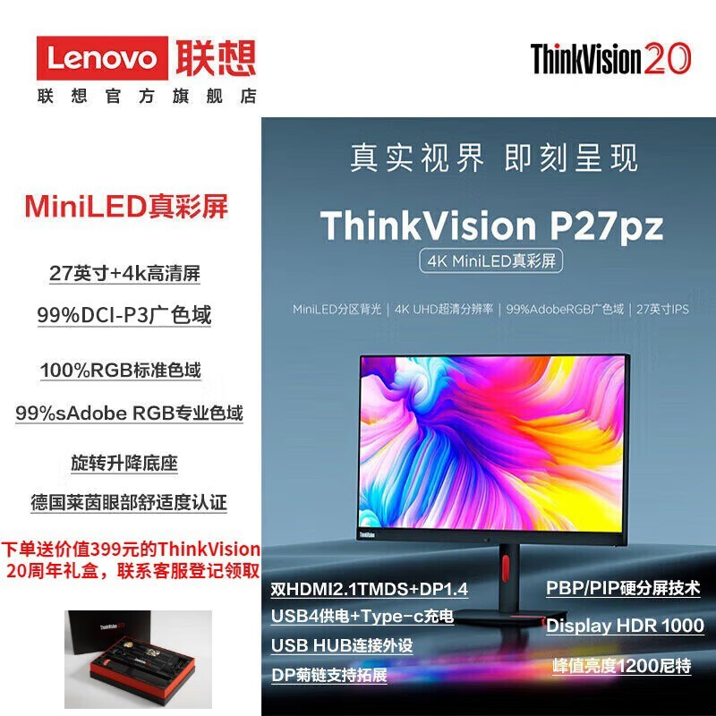 联想P27pz-30:MiniLED真彩2K/5K高清显示器,专业设计,卓越色彩,6499元起