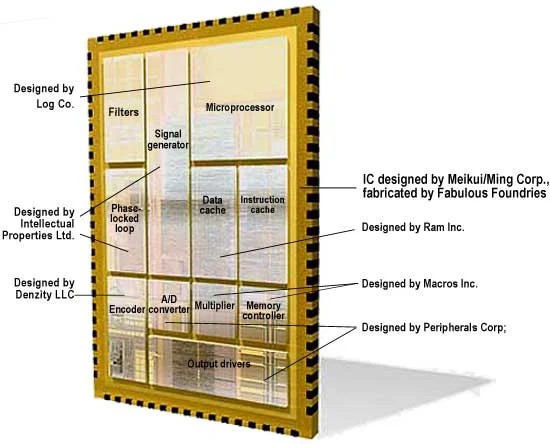 构建片上系统:兼容性是构建 SoC 的关键,正如这个虚构的 IC 设计所说明的那样。为了构建它,一家无晶圆厂半导体公司使用了从几家 IP 公司获得的知识产权 (IP) 块。无晶圆厂设计人员必须确保所有模块都能协同工作,并与选择制造芯片的代工厂的半导体工艺兼容。