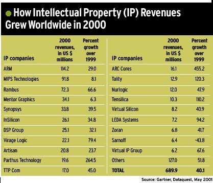 利润和巨大的市场增长就在前方。商业 IP 是价值 8000 亿美元的 IC 市场中最繁荣的领域之一。它由第三方开发的逻辑、存储器和处理器内核组成,供小型设计公司和大型 IC 制造商重复使用,2000 年的总收入为 6.9 亿美元,比 1999 年高出 48%。理想的情况是使设计人员能够从不同 IP 供应商制造的混合搭配产品中快速将 SoC 插入在一起 [见下表]。