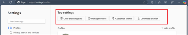 新版Edge设置主页新增了矩形按钮,用户可以通过这些按钮直接跳转到常用的设置页面。