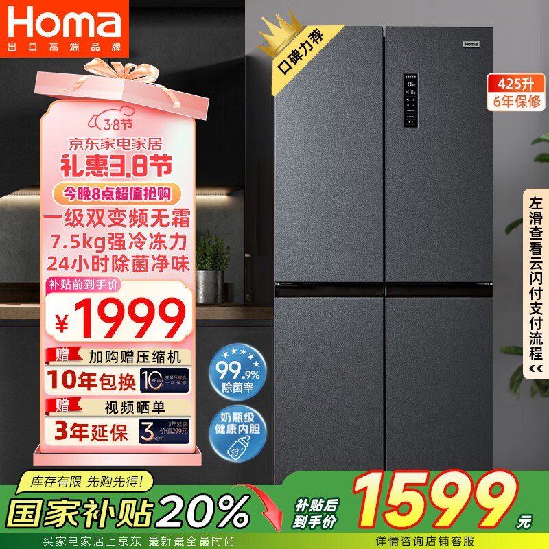 奥马风冷十字对开门冰箱425升大容量保鲜静音家用