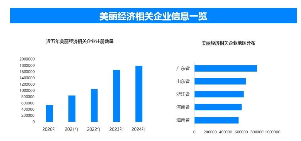 数据显示,截至目前我国现存在业、存续状态的美丽经济相关企业超833.9万家。其中,2024年新增注册相关企业超179.2万余家,从企业注册数量趋势来看,近五年间,美丽经济相关企业的注册数量呈现出逐年增长的态势,并在2024年达到顶峰。从区域分布来看,广东省以美丽经济相关企业超过80.2万家的数量排在全国首位,此外分别为山东省、浙江省、河南省和海南省。