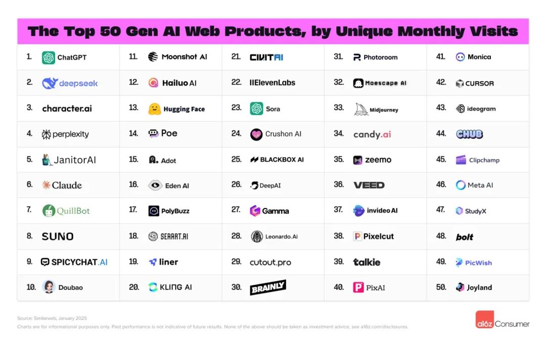 C114讯 3月7日消息(苡臻)近日,全球知名投资基金、咨询公司Andreessen Horowitz(以下简称:a16z)发布了2025年全球100个生成式AI应用排行榜。