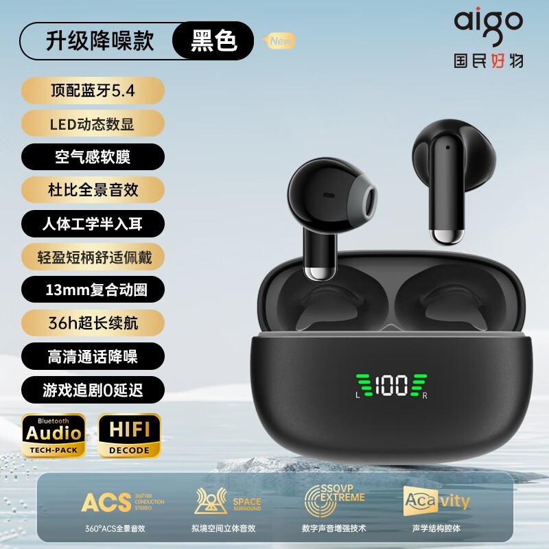 爱国者真无线蓝牙耳机黑色经典款游戏低延迟HIFI音效