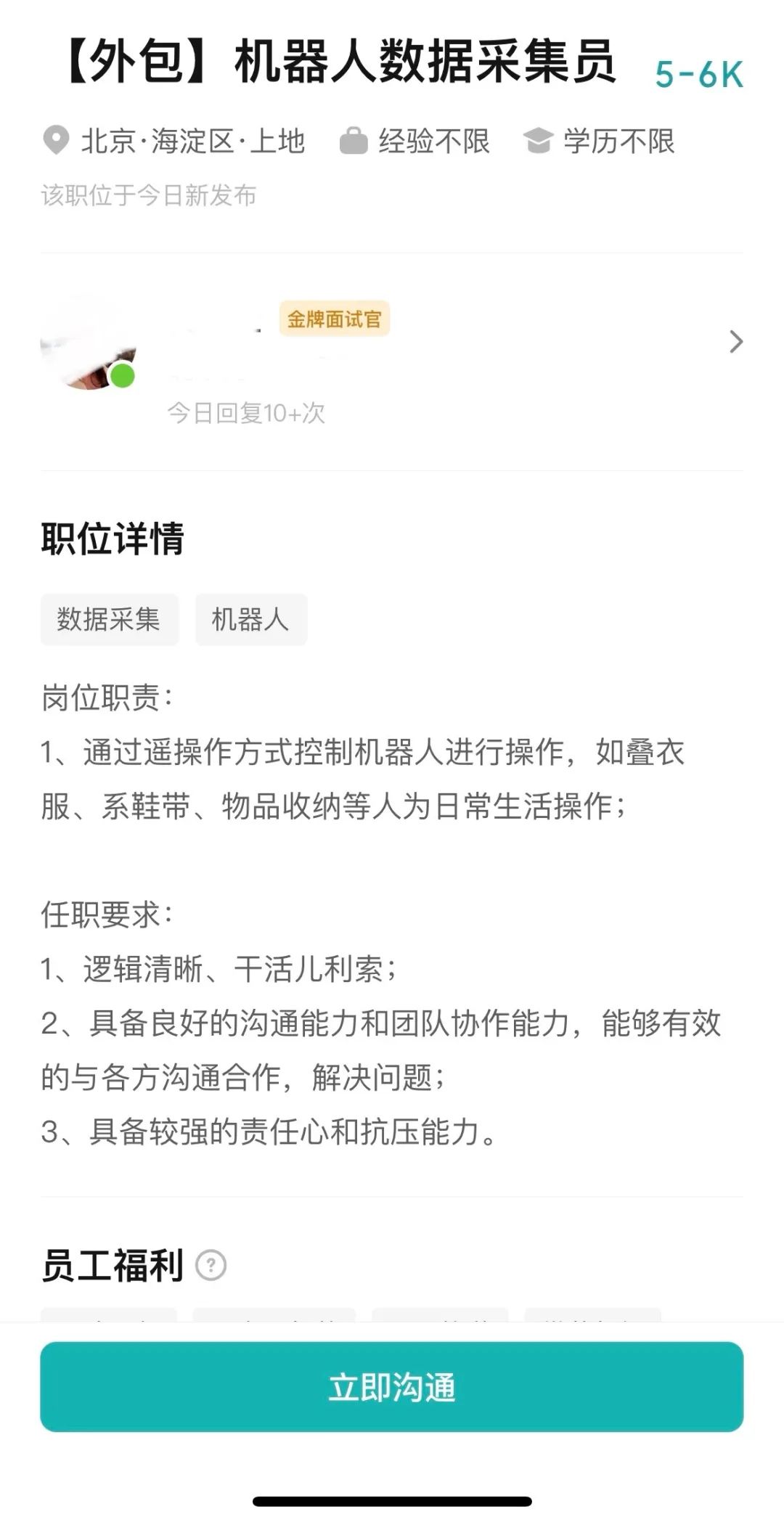 在春晚过后,最近宇树机器人又火了一次。上周,宇树机器人发布了一条机器人转身踢腿,打了一套功夫拳的视频,发布一周就收获了快五万的点赞。一套功夫打下来,机器人占领世界似乎已经可以期待了?在机器人越来越像人的背后,可能却是有着一批人在「负重前行」。近期,极客公园发现,招聘软件上已经悄悄上架了一批工作信息。员工的唯一工作,就是教机器人如何更像人。01 新物种工作笔者是在去年,开始发现各大一线城市的招聘平台正在悄悄上架一批新的工作。标题为数据采集专员,或者更直接的——机器人数据采集员,这个「新物种」工作,是完全是为机器人提供服务的。工作描述很简单——就是操作机器人,做一些人类日常会做的行为。一个工作描述这样形容道:控制机器人进行操作,如叠衣服、系鞋带、物品收纳等日常生活操作。而另一个工作描述则这样写道,「根据桌面零件分拣」的场景,操作动作捕捉服来操控机器人的动作。一些其他类似的工作描述中,还出现了不晕 3D,身体强壮,了解一些编程基础之类的要求。这到底是怎样的工作?笔者潜入了一个动作捕捉的招聘群中,和招聘者进行了一次聊天。笔者很快了解到,该招聘岗主要是为国内某机器人公司进行服务,采集机器人的动作数据。主要分为两种岗位,一种是带着动作捕捉设备,远程操作机器人——工作人员站在机器人旁边,拿取面前的东西,而通过动作捕捉设备的传输,机器人会摆出和几乎一样的动作拿去机器人面前的东西,这在机器人领域的术语叫做遥操作。过去在新闻中经常出现有人操作机器人进入危险环境作业,就是使用的遥操作方式。而另一种则是面对屏幕操作机械臂。仍然是工作人员操作机械臂,而屏幕里的机械臂会做出一样的动作,只不过实体空间中并没有真正的物品可以拿取,工作人员操作机械臂的目的是让屏幕里的机械臂拿取虚拟空间的物品。有点像是隔着屏幕操控抓娃娃机。两种工作对操作人员的要求都不高,都是做出最基本的人类动作就可以。因此招聘对学历等硬性条件并没有要求。不过有趣的是,第一类岗位,对操作人员的身材倒是有要求:身高 165~170 左右,体重 62kg 内,不能有肚子,男生。第二类岗位则男女不限。笔者又查看了其他公司的类似的岗位,工资在 5000-10000 不等。而这家公司,则是按天计费,每日 200 元。招聘者特别问了笔者,你是计算机专业的吗?在得到否定回答后,招聘人员大方提起,现在有一个领域正在「崛起」,就是人工智能!不要看目前只是一个兼职岗位,未来可能会变得非常重要。当笔者问起,会不会已经招满了,招聘人员则表示,位置很多,第一批就有几百人,而后面北京、上海、广州,都在陆续开类似的岗位。02 卖动作给机器人的工作,正在迅速扩张卖动作给机器人?听起来是一个很奇怪的事情。为什么要这么做?带着疑问,笔者采访了动作捕捉设备提供商诺亦腾的联合创始人、CTO 戴若犁博士。戴博士马上肯定了这一趋势的存在。「是的,我们也观察到了类似的现象。诺亦腾每年会卖出几千套动捕设备,是全世界出货量最大的动捕的设备提供商,在过去十年,卖给机器人企业的动捕装备一直不超过我们出货量的 5%,不过,事情在 2023 年发生了变化。」戴博士表示。戴若犁回忆道,一般而言,机器人企业采购动捕设备,通常用来操作机器人在危险地区进行一些特殊操作,这样的需求不会很多,通常的采购都是一套两套这个量级。「我们的设备算是全球性价比最高的了。不过即使这样,贵的设备大概要十几万块钱一套,便宜的设备也要大几万块钱。只有应急演练、消防这样的市政甚至军事项目才会进行百套左右的采购。」戴若犁表示。而2023 年开始,诺亦腾开始逐渐接到越来越多的机器人企业的订单,而且一次就是上百台——这些订单,正是为前面所述的工作岗位服务的。2023 年,正是人形机器人开始爆发的前夕。在 2023 年前,人形机器人在机器人的研究发展中,相对是一个异端。大部分需要机器人的能力,用一个专用的机械臂已经可以解决的很好,为什么要研究人形机器人呢?笔者记得 2023 年,第一次来到世界机器人大会时,就曾经想过这个问题。这背后,其实是技术的一次大跳跃。2022 年-2023 年,大语言模型的进展,第一次解决了机器人泛化性的理解和规划。也就是说,现在和机器人说话,机器人第一次可以开始理解了,甚至可以自己对于语言背后的含义进行拆解,能够意识到「拿桌上的水果」这件事指的就是拿起桌上的某个特定苹果了。这时候,人形机器人的卡点,出现了新的变化——不在于智慧,在于动作能力上了。在智慧能力出现突破之后,如果人形机器人的动作的泛化能力能够进一步突破,那么机器人的应用场景将有很大的扩展。而在机器人的动作问题上,实际上则有两个分支。一个是运动能力(locomotion),我们也可以简单理解为下肢动作。一个是操作能力(manipulation),我们也可以简单地理解为上肢动作。我们看到的宇树机器人,能打拳、能跳舞,其擅长的,正是机器人的「下肢能力」。而正如我们所看到的,虽然仍面临着承载力等一系列问题,机器人的「下肢能力」已经相对成熟。而机器人的「上肢能力」则是完全另外的命题。「四足平衡或者双足平衡,其实容错能力是比较好的。你一步踩错,它通过迅速的纠偏,通过一些算法其实可以迅速找回来的。但是泛化的抓