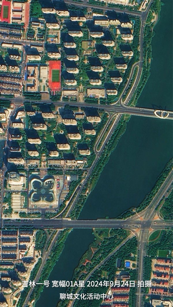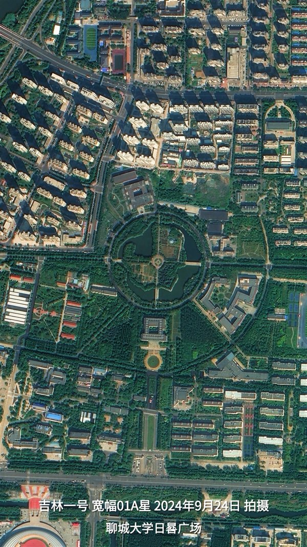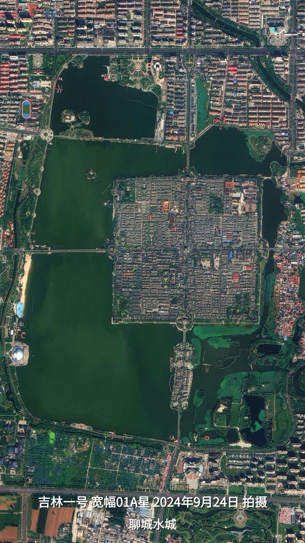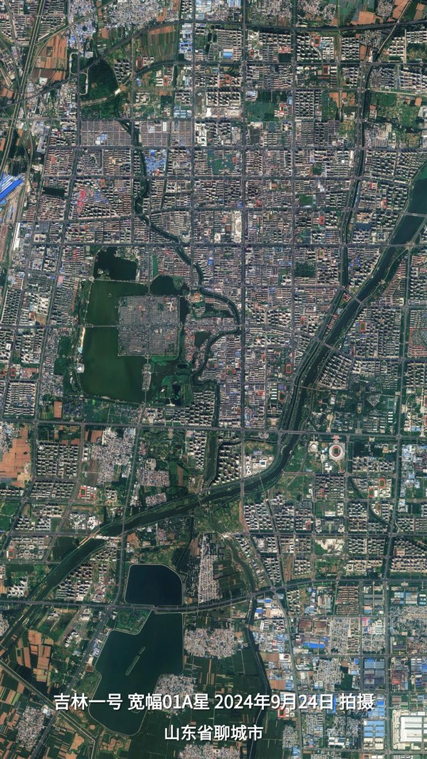 从吉林一号卫星拍摄的影像上看,古城呈规整矩形,南北轴线以光岳楼为中心,与东西轴线交叉形成“十字街”格局。