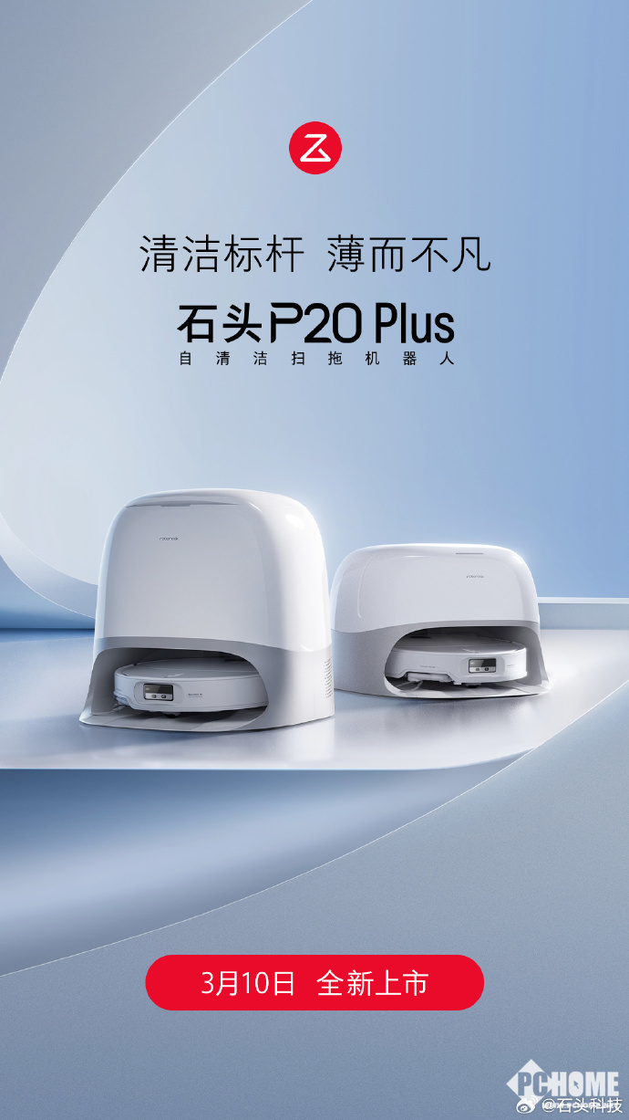 3月7号消息,石头科技官宣了拥有7.98cm超薄机身的石头P20 Plus自清洁扫拖机器人,将在3月10号正式上市。