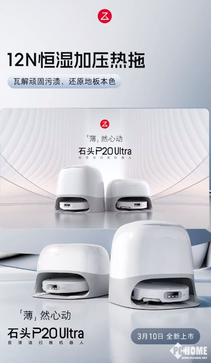 石头科技官宣了拥有7.98cm超薄机身的石头P20 Plus自清洁扫拖机器人,将在3月10号正式上市。