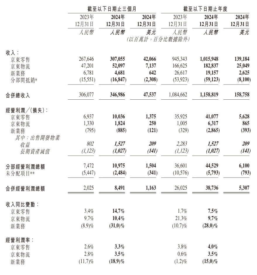 2024年全年,京东收入为11,588亿元,同比增长6.8%;经营利润为387亿元,同比增长48.8%,经营利润率为3.3%;全年归母净利润为414亿元,同比增长71.1%,净利率为3.6%。