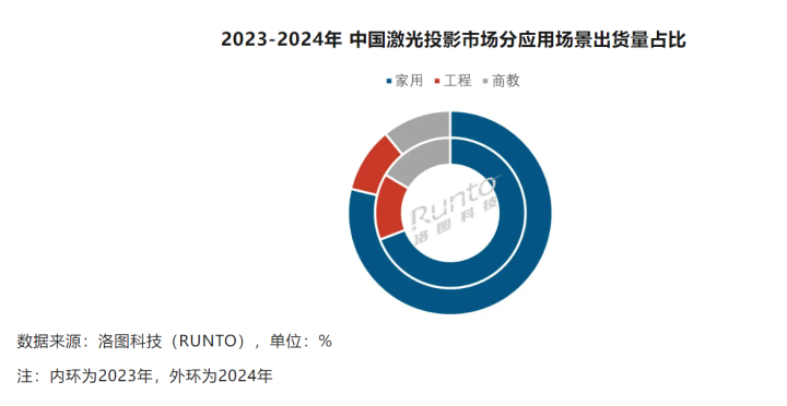 洛图科技表示量额背离的现象反映了市场的内外环境变化,首先是消费整体偏弱,整体信心不足;其次是激光投影技术的进步和成熟支撑了产品平均价格下降。以三色激光技术为代表的核心部件国产化取得重大突破,大幅降低了综合成本;另外,家用市场强劲增长与商用市场明显下滑形成鲜明对比。