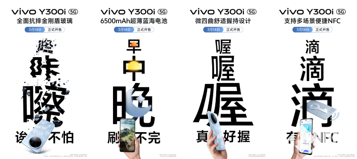 3月7日,vivo在社交媒体发文称,vivo Y300i将搭载全面抗摔金刚盾玻璃、6500mAh超薄蓝海电池,采用微四曲舒适握持设计,支持多场景便捷NFC,可使用门禁卡、碰一碰支付、电动自行车解锁等功能。