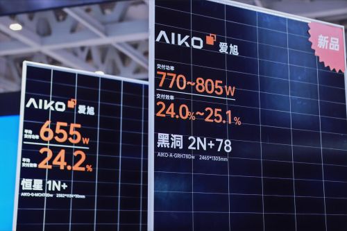 此次参展,爱旭除了展出适配集中式场景的“恒星”系列、工商业场景的“慧星”系列、户用场景的“黑洞”系列以及第三代满屏组件产品外,还推出了一款全新户用组件。该组件尺寸为2465*1303mm,转换效率达到24.0%至25.1%,功率最高可达805W,其在具备爱旭N型ABC原有功能特性的基础上,针对中国户用市场需求设计了更大版型,拥有更高功率,预计于今年下半年推向市场。