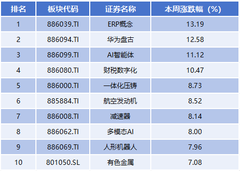 板块方面,本周涨幅居前的概念板块分别为ERP概念、华为盘古、AI智能体、财税数字化、一体化压铸,累计涨幅分别为13.19%、12.58%、11.12%、10.47%、8.73%。
